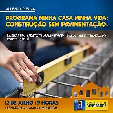No dia 12 de julho, próxima sexta-feira, será realizada – a partir das 9h – uma Audiência Pública na Câmara de Vereadores de Campo grande para discutir a imposição do governo federal de asfalto para financiamento de imóveis pelo Programa Minha Casa Minha Vida. A Audiência foi proposta pela vereadora Dharleng Campos (PP) a pedido da Associação dos Construtores de Mato Grosso do Sul (Acomasul).