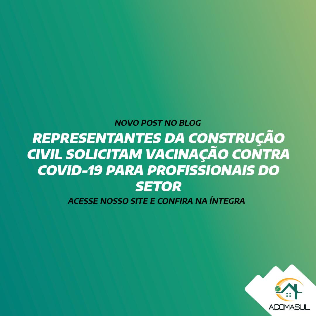 Na última sexta-feira (11), em carta aberta assinada pelo Conselho de Arquitetura e Urbanismo de Mato Grosso do Sul (CAU/MS), Conselho Regional de Engenharia e Agronomia (CREA-MS), Acomasul (Associação dos Construtores de Mato Grosso do Sul) e Sinduscon (Sindicato Intermunicipal das Indústrias da Construção), foi solicitada a inclusão de todos os profissionais da construção civil nos grupos de vacinação contra covid-19.