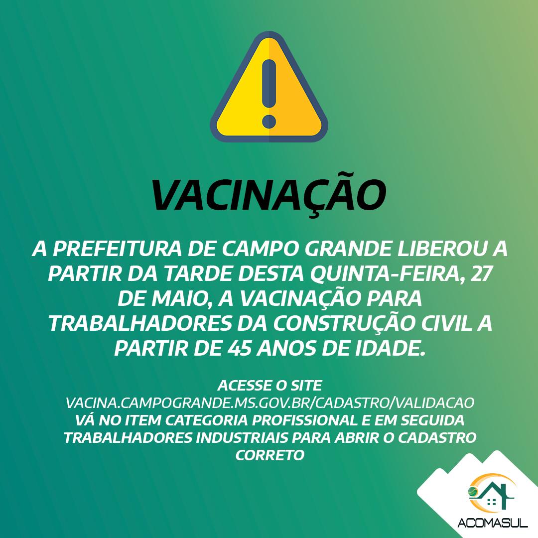 A prefeitura de Campo Grande liberou a partir da tarde desta quinta-feira, 27 de maio, a vacinação para trabalhadores da construção civil a partir de 45 anos de idade.